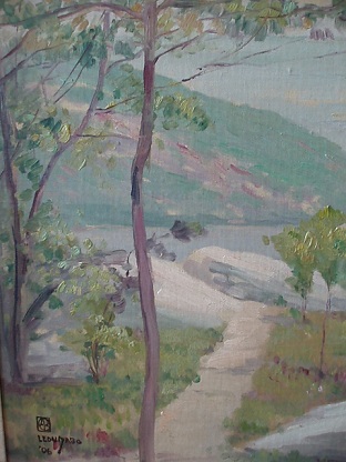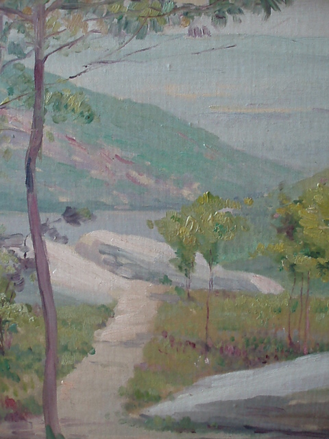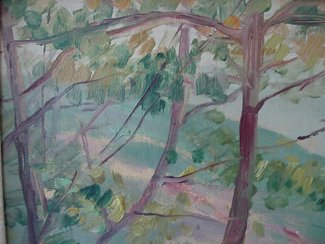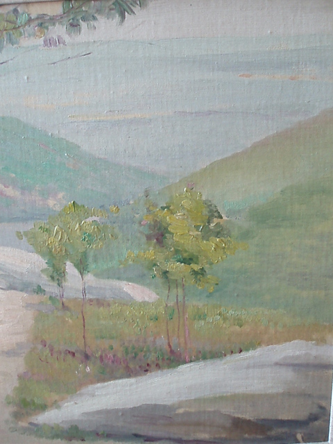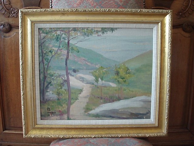 Description: "Hudson River View 1906" by Leon Dabo, NA(1865-1960)Oil on Canvas. Framed in simple gilt frame.